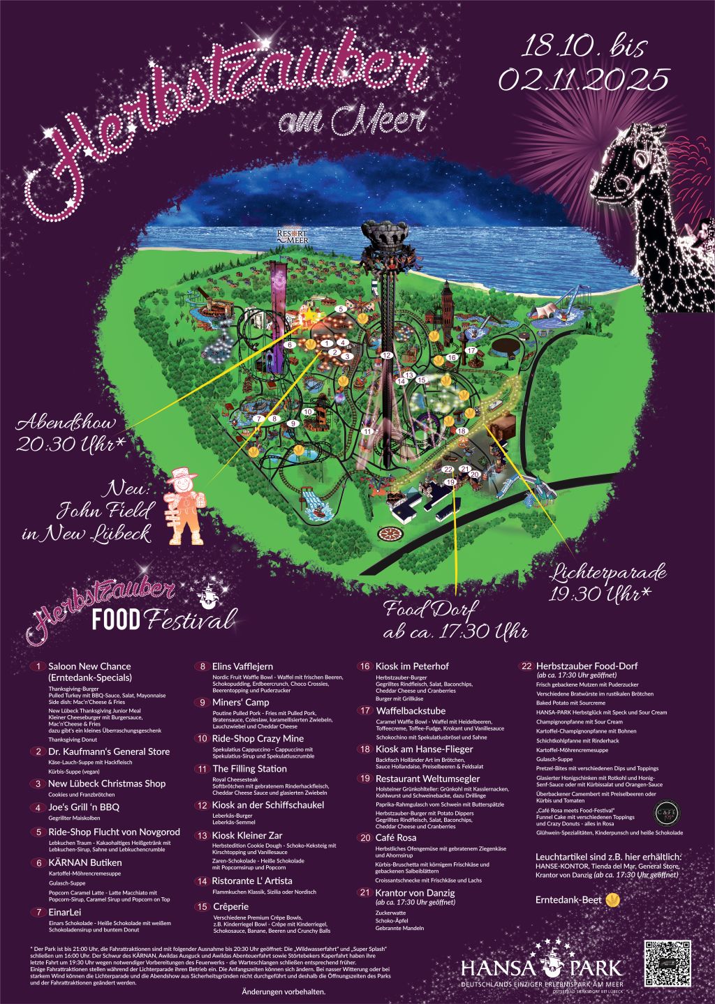 Neben alt bekannten und geliebten Klassikern wie dem Holsteiner Grünkohlteller im Restaurant Weltumsegler oder der Poutine Pulled Pork im Miner’s Camp haben unsere Gastronomen wieder viele Highlights für Sie vorbereitet: Ob herzhafter Thanksgiving-Burger im Saloon „New Chance“, einer süßen Verführung durch verschiedene Premium Waffle Bowls in Elin’s Vafflejern und der Waffelbackstube oder den Cookies und Franzbrötchen in unserem New Lübeck Christmas Shop. Im Herbstzauber Food-Dorf gibt’s u.a. Glühwein, leckere Mutzen und deftige Pfannengerichte.