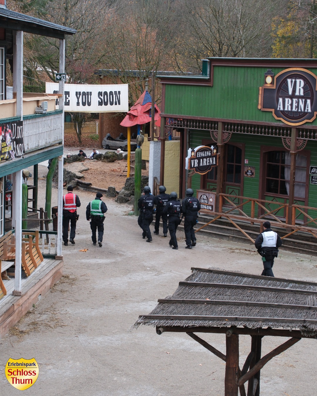 In den vergangenen drei Wochen nutzten Einheiten der Bayerischen Bereitschaftspolizei den Freizeitpark an einzelnen Tagen für realitätsnahe Trainings. Dabei wurden verschiedene Einsatzszenarien geprobt, unter anderem in der Westernstadt, im Romantiksaal und auf dem GlampingPark.