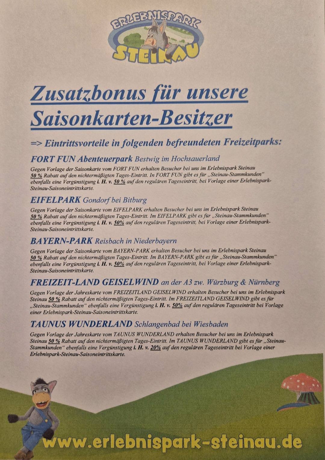 Saisonkartenbesitzer können sich nun auch über den Bayern-Park, das Freizeit-Land Geiselwind und dem Taunus Wunderland freuen. Mit der Saisonkarte können Erlebnispark Steinau-Besitzer bei den genannten Freizeitparks bei Vorlage einen vergünstigten regulären Tageseintritt bekommen, dieser liegt bei 50 % und beim Taunus Wunderland bei 20 %. Im Gegenzug bekommen Saisonkarteninhaber der anderen Freizeitparks, einen 50 % Rabatt auf den nichtermäßigten Tages-Eintritt im Erlebnispark Steinau an der Straße. Die ganzen Details kann man hier nachlesen: