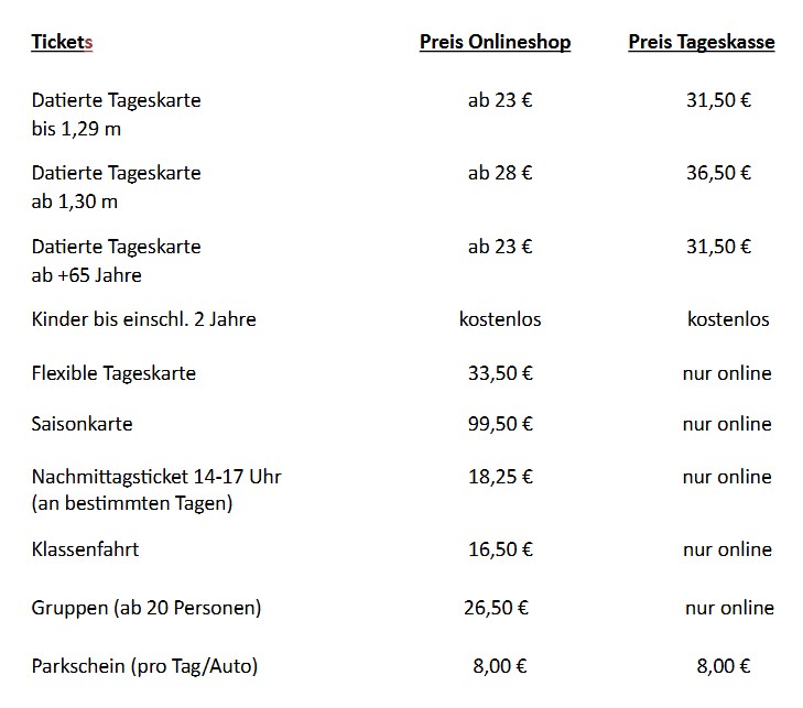 Datierte Tagestickets bis 1,29 m und ab +65 Jahre sind ab 23 € erhältlich – Tickets ab 1,30 m ab 28 €.