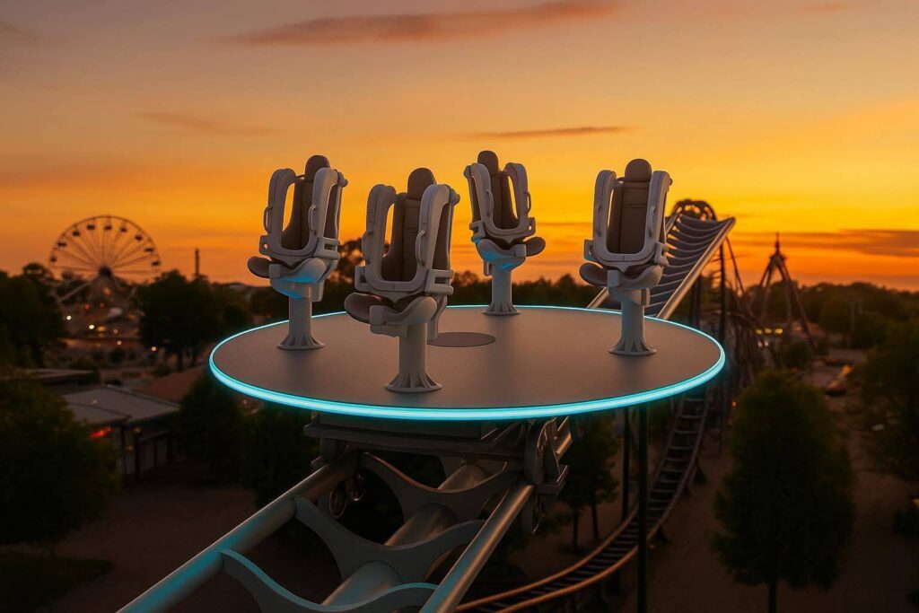 Ein neues Modell von Marc Rides mit dem Power-Pivot-Achterbahn vorgestellt, diese besteht aus vier einzelnen, drehbaren Sitzen, die auf einer Drehscheibe montiert sind und kann optional auch mit einem Antriebsmotor ausgestattet werden.Bildquelle: Marc Rides (5.12.25)
