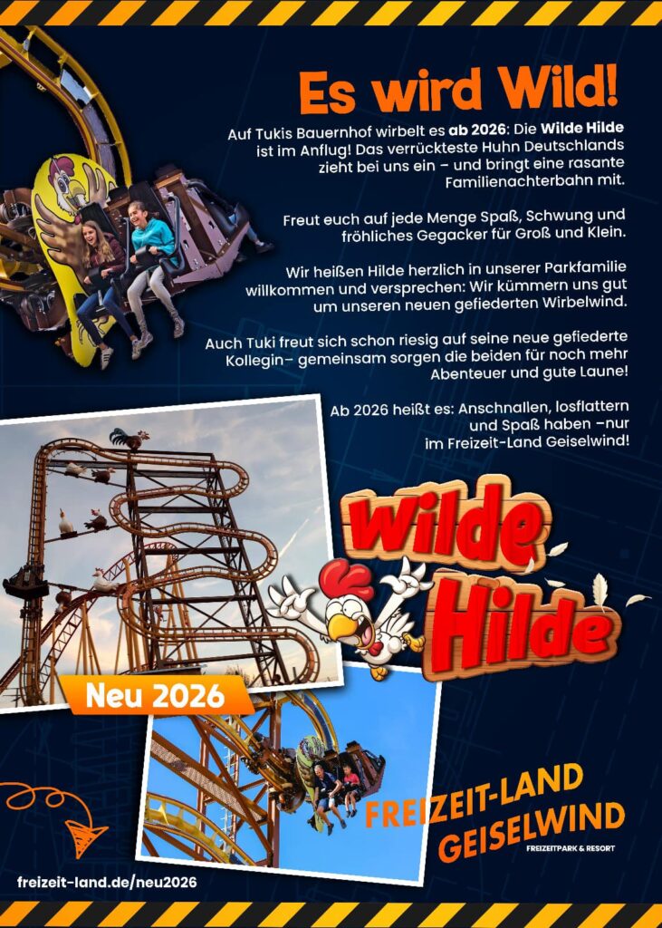 Das Freizeit-Land Geiselwind hat seine erste neue Attraktion enthüllt. Dabei handelt es sich um die Familienachterbahn „Wilde Hilde“ aus dem Schwaben Park.Die Achterbahn findet in „Turkis Bauernhof“ ab 2026 ihren Platz.In einem Beitrag heißt es vom Freizeitpark:„Wir heißen Hilde herzlich in unserer Parkfamilie willkommen und versprechen: Wir kümmern uns gut um unseren neuen gefiederten Wirbelwind“.Bildquelle: […]