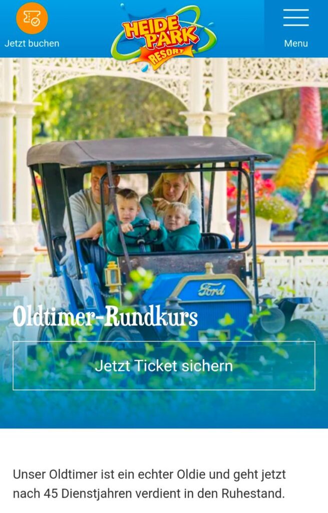 Der „Oldtimer-Rundkurs“, der mehr als 45 Jahre seine Runden im Heide Park Resort gedreht hat, wird den Park zum Ende der Saison verlassen. Wie die Fläche neben dem Eingang künftig genutzt werden soll, ist bisher nicht bekannt.Bildquelle: FreizeitparkCheck (2.9.25)